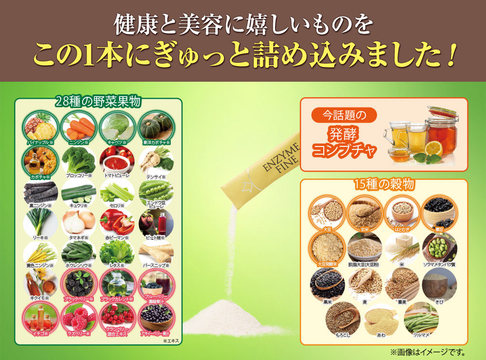 穀物果物野菜発酵粉末(大豆、脱脂大豆、米、麹発酵粉末、発酵紅茶エキス粉末、黒大豆、乾燥パイナップル粉末、野菜混合エキス粉末、ベリー混合エキス粉末、黒米、大麦、はとむぎ、蕎麦、きび、もろこし、あわ、ツルマメ、玄米、カキ殻発酵粉末、枯草菌)、ラクチトール、パイナップル果汁粉末、フラクトオリゴ糖、大豆発酵粉末、分離大豆たん白、アルロース/微粒二酸化ケイ素、香料、酸味料、甘味料(ステビア)、(一部にそば・乳成分・大豆を含む)